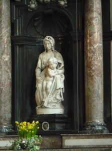 • Puis (tout cela se passe en une semaine environ…), je trie mes photos restées en plan depuis un an et demi dans des albums et trouve à la fin d’un d’entre eux, une photo seule, séparée des autres : une statue sur laquelle je suis tombée par hasard à Bruges en entrant dans une église : statue de Vierge à l’enfant de Michel-Ange.