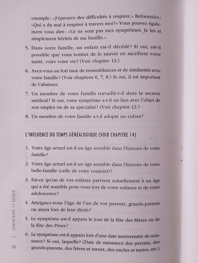 Conformément aux synchronicités Jungiennes et à la charge énergétique archétypale du « Même », l’auteure par des faits divers et retours d’entretien avec des personnes nous permet de prendre conscience de la répétition dans les familles (dates, âges, lieux, noms et prénoms, métiers etc. etc.) et de limiter les prises de risques (maladie, accident, faillite, etc.) lors de l’expression aveugle du « Même ». (A l’origine je le rajoute des situations incestuelles, brouillage des générations et participations mystiques négatives. On comprend mieux l’importance de l’individuation et du fait de se différencier de la masse informe de l’inconscient familial pour hériter uniquement de ses bons aspects).