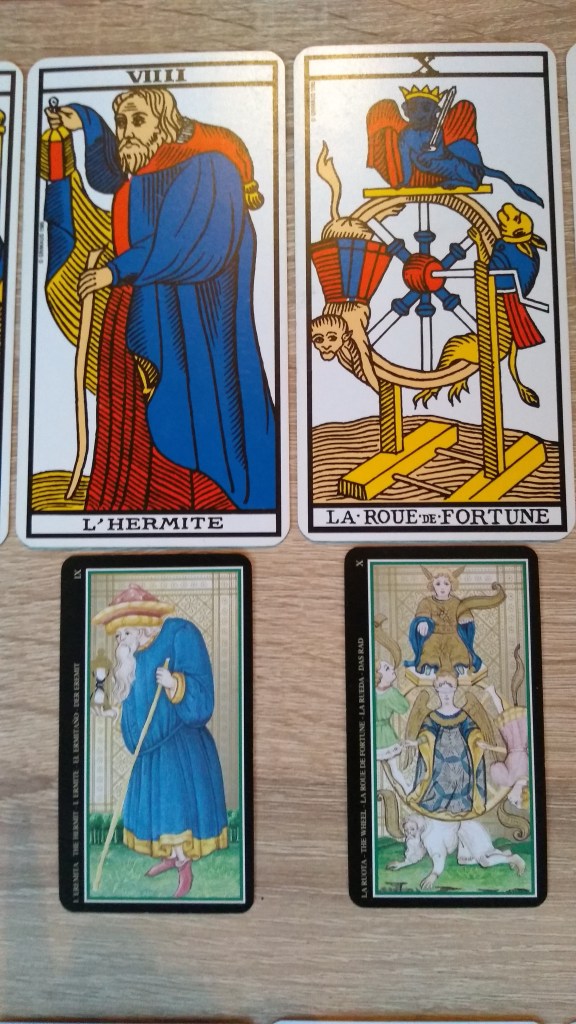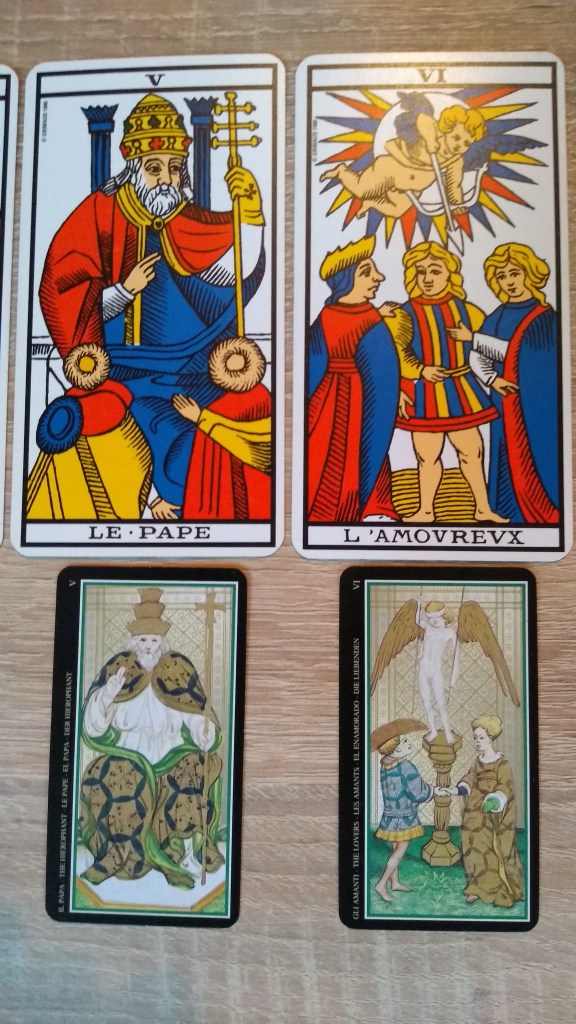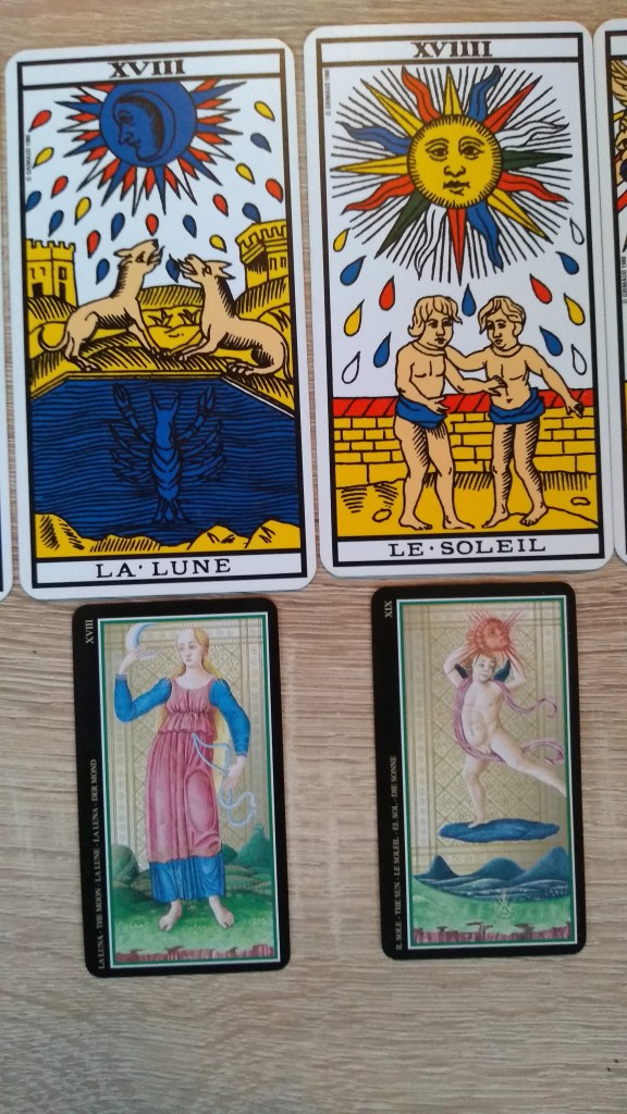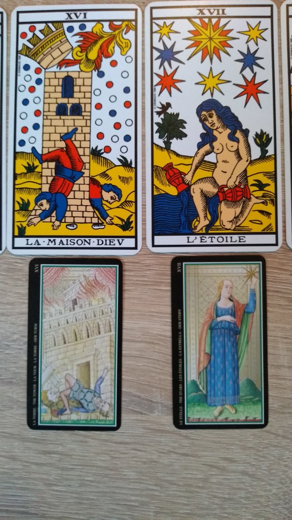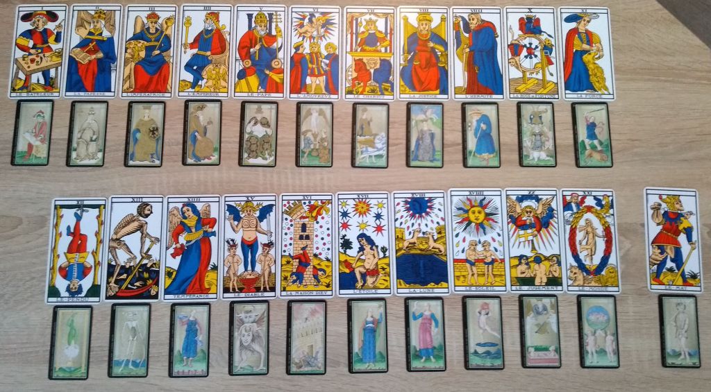 Quelques jours après la rédaction de ce texte m’est revenu un rêve que j’avais oublié concernant le tarot de Marseille: je voyais des livres dans une benne de déchetterie et à côté, un jeu de tarot dont je savais que je devais le prendre à la place des livres (que je dévore au quotidien depuis l’enfance). Quelques temps plus tard, j’ai acheté ce jeu dans la réalité et découvert ses images dans leur ensemble. J’en connaissais déjà quelques-unes au travers des interprétations de Tristan Moir.
